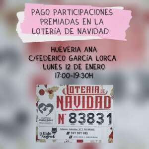 Para facilitar un poco más el cobro de las participaciones premiadas en la lotería de Navidad, el lunes 13 de Enero estaremos en la hueveria Ana en la calle Federico García Lorca desde las 17:00 hasta las 19:30 horas para que podáis venir a cobrarlas.